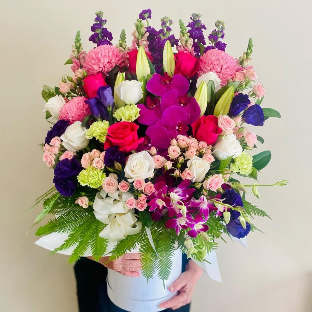 A stunning mix of stock, snap dragons, roses, spray roses, mummas and orchid arranged in our extra large hat box, this beauty is sure to put a smile on mum's face.