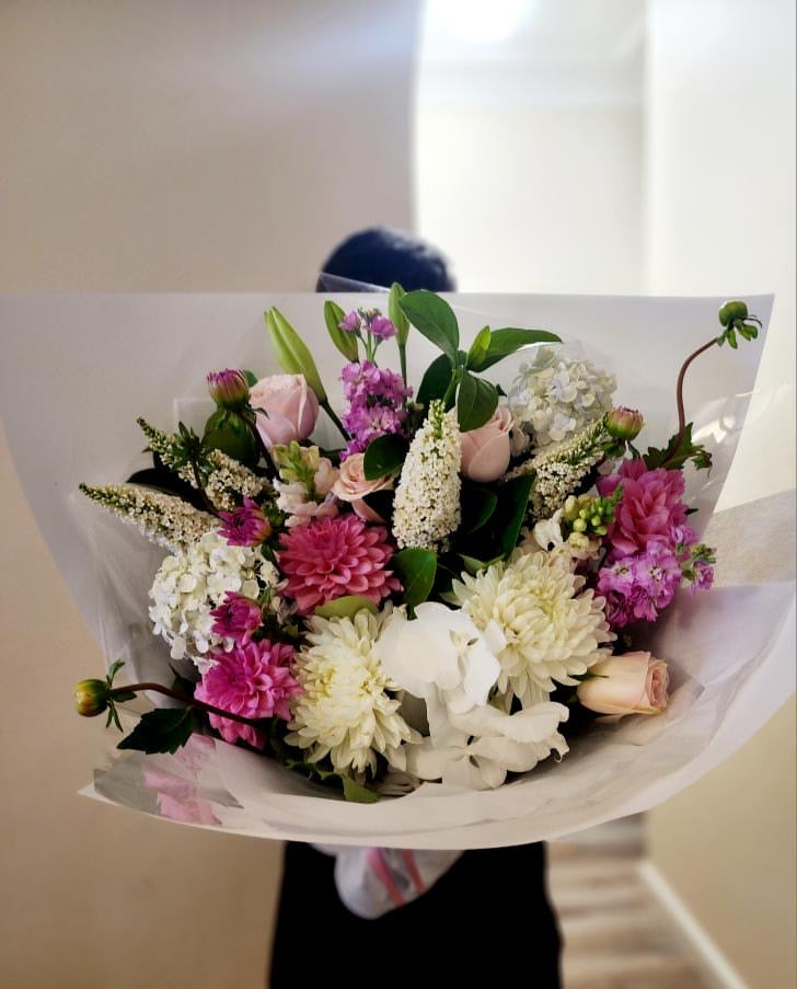 Stunning assortment of pastel blooms arranged in a bouquet with foliage(please note some flowers may be substituted due to season availability)